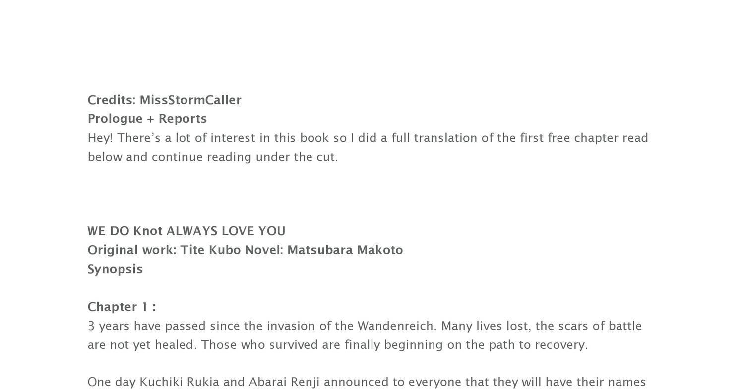 These items are shipped from and sold by different sellers. Bleach we do knot always love you. We do knot always love you often abbreviated as wdkaly is a bleach light novel series written by makoto matsubara with content provided by tite kubo. There s a lot of interest in this book so i did a full translation of the first free chapter read below and continue reading under the cut.