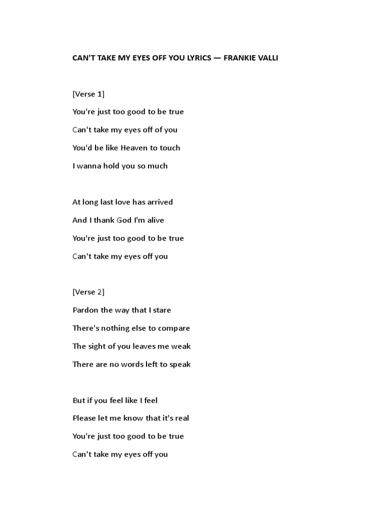 Can t take my eyes off you 歌詞 you re just too good to be true can t take my eyes off of you you re be like heaven to touch i wanna hold you. Can t take my eyes off you 我無法將視線從你身上移開. I love you baby can t take my eyes off you 歌詞 mymusic懂你想聽的 打開app立即開始聽歌.